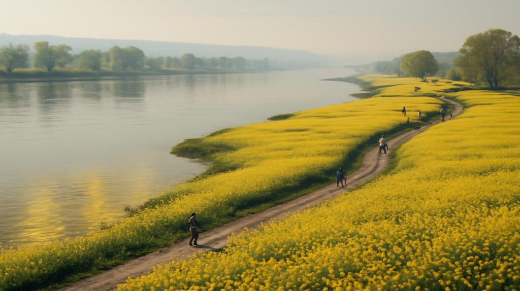 봄바람이 강 위에서 불어오고, 18~20℃ 사이의 포근한 공기가 얼굴을 스칩니다. 물가를 따라 걷다 보면 부드러운 흙냄새와 함께 달콤한 꽃향기가 코끝을